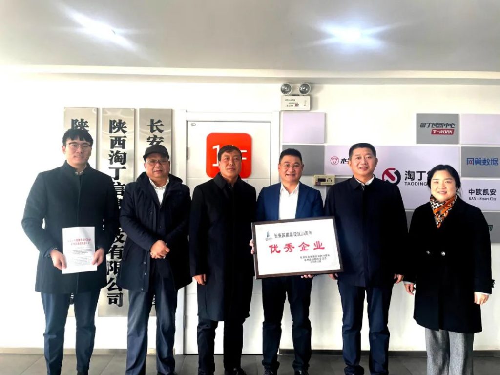 为表彰先进,树立典型,对长安区撤县设区20周年经济社会发展做出贡献的先进单位、企业进行表彰。2023年1月6日下午,长安区委常委、统战部部长李鹏程,长安区委统战部常务副部长范阿利,区人大常委会副主任、区工商联主席姚小强,区工商联党组书记、常务副主席李逢仓等领导莅临淘丁集团,共同为淘丁集团颁发“长安区撤县设区20周年优秀企业”荣誉称号。